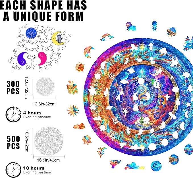 - 【Unique Wooden Puzzle】 The puzzle is inspired by nature, colorful, unique wooden puzzle. Original and vivid hand-painted art, which is fascinating and worthy of being used as an aesthetic home decoration. Mysterious patterns and small pieces of east eggs give you the ultimate puzzle experience