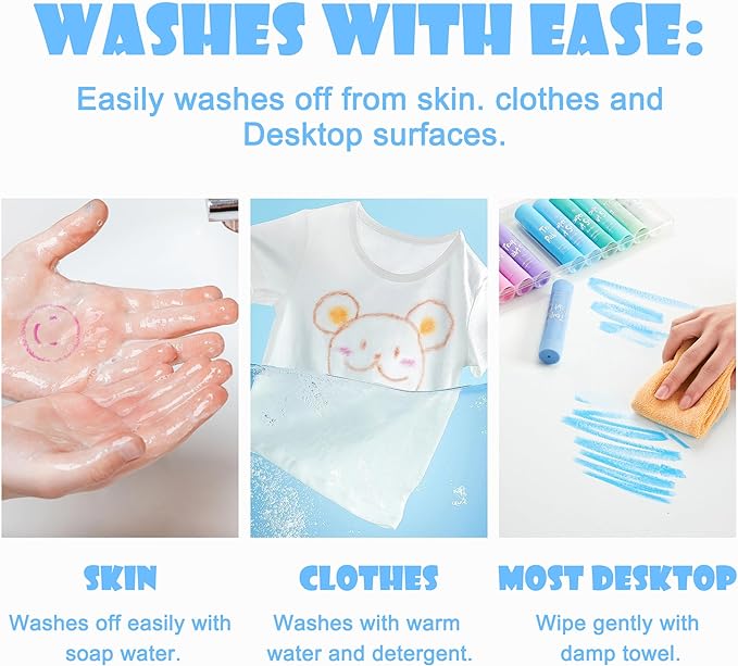 - QUICK-DRYING & WASHABLE: Dries in 90 seconds. So there will be no smearing. MESS FREE! These paint sticks are WASHABLE and can be cleaned with soap water easily on non-porous surface. Parents no longer have to worry about painted shirt cuff issue or horrible table disasters.