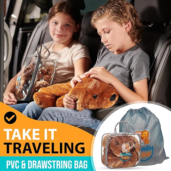 - Huggable Comfort – Ground on the go with your weighted stuffed animals. Give kids a reassuring squeeze they can take in your 2 included travel bags with their 5 lb. weighted plush pal.