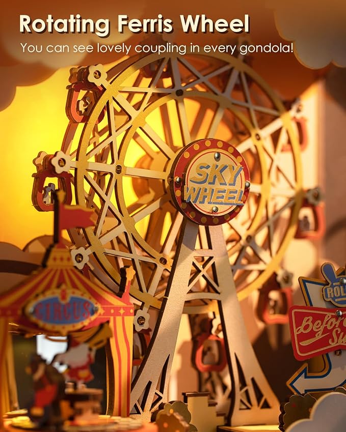 - 【EXQUISTE DETAILS】Lots of surprising details are hidden in the stunning book nook. On the rotating ferris wheel, you'll see tiny figures in different gondolas. A cute bear is riding on the monocycle around the clown. When the light's on, it looks like a real sunset glow, creating beautiful silhouette on two sides.