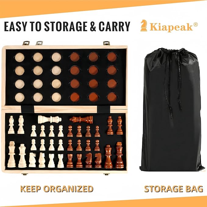 - 【Portable and Easy to Store 】 - The wooden chess board is designed to be foldable, and the pieces can be securely & tightly held inside the box by foam, No chaotic and noisy. The Folding size is similar to 2 books size, its compact size makes it easy to fit in a backpack, perfect for Travel and School Playing.