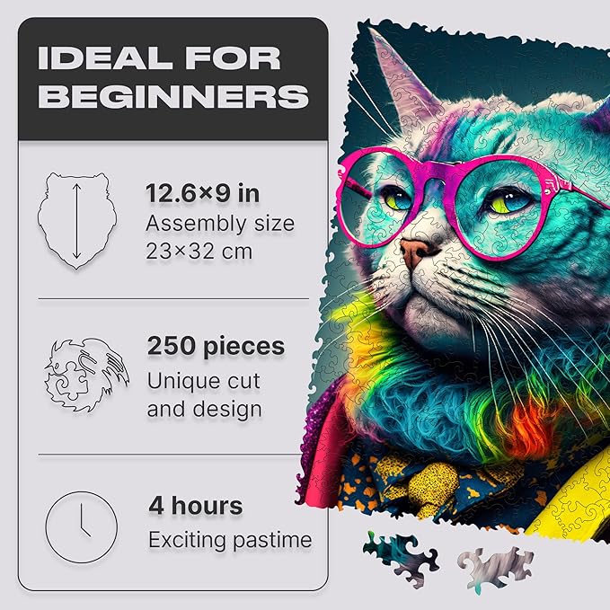 UNIDRAGON Original Wooden Jigsaw Puzzles - Pop Art Glow Up Collection - Criticat - Cat Puzzle 250 Pieces, Beautiful Gift Package, Wooden Puzzle for Adults