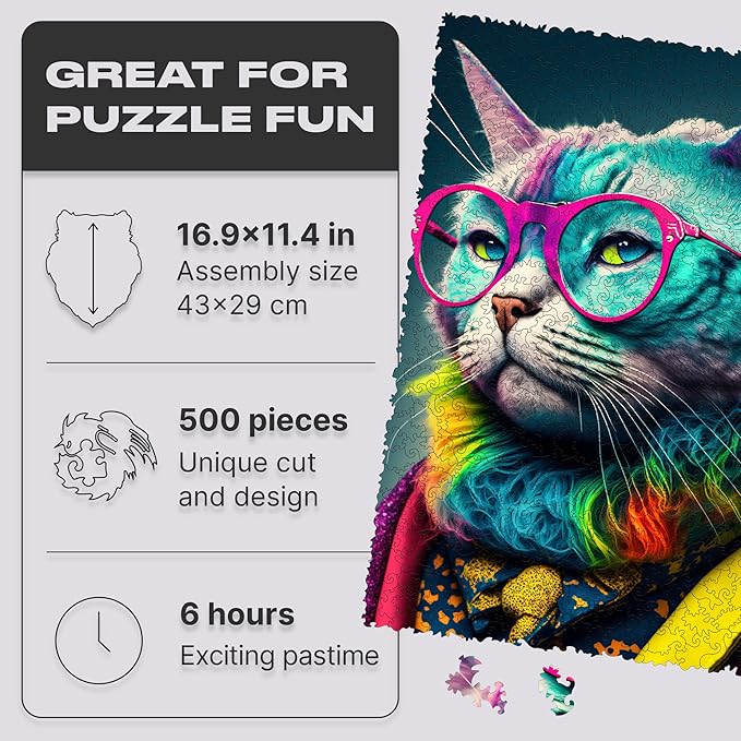 UNIDRAGON Original Wooden Jigsaw Puzzles - Pop Art Glow Up Collection - Criticat - Cat Puzzle 500 Pieces, Beautiful Gift Package, Wooden Puzzle for Adults