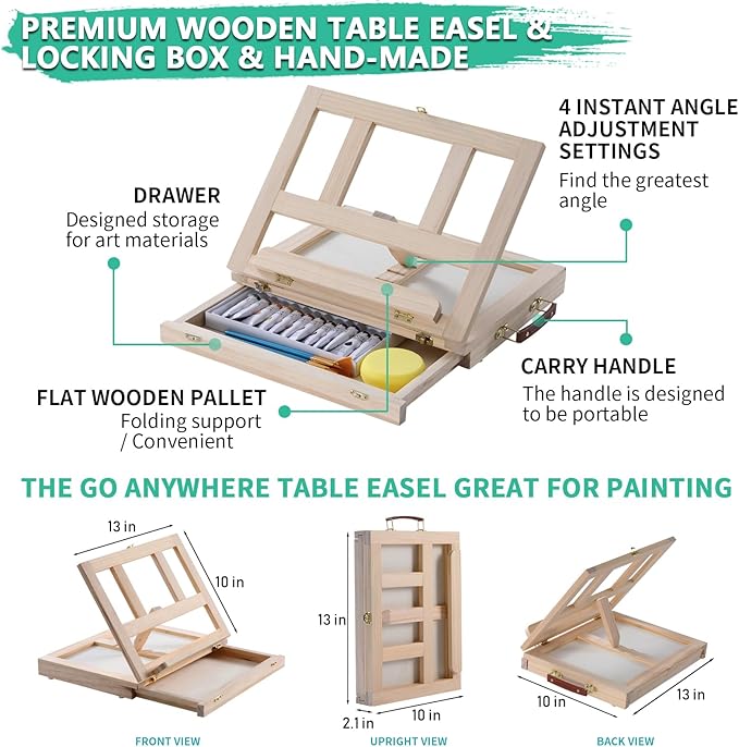 - PORTABLE AND LOCKABLE: Take your creativity anywhere! The Foldable wood box has a leather handle to make it easy to carry and store. The painting set is perfect for outdoor drawing, art classes, or traveling.