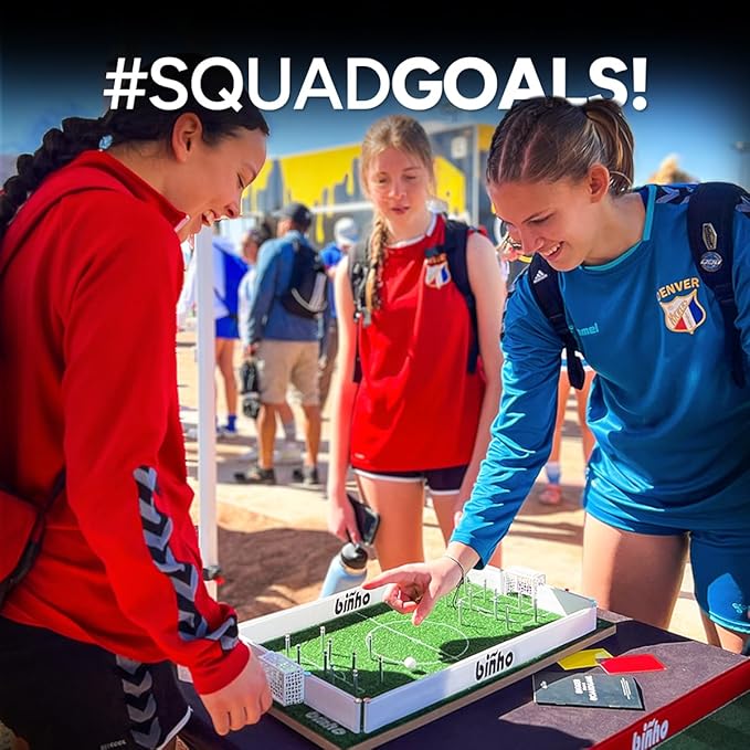 - Complete Set - Create memorable moments with our Binho Board Green Turf. Each set comes with everything you need: 22” x 13” x 3” Binho board, 2 balls, 2 score pins, 2 red/yellow cards, 2 goals, 20 aluminum metal removable player pieces, 12 barrier pieces, 6 white exterior elastic bands (2 long, 4 short), 1 rules pamphlet, and 1 drawstring bag.