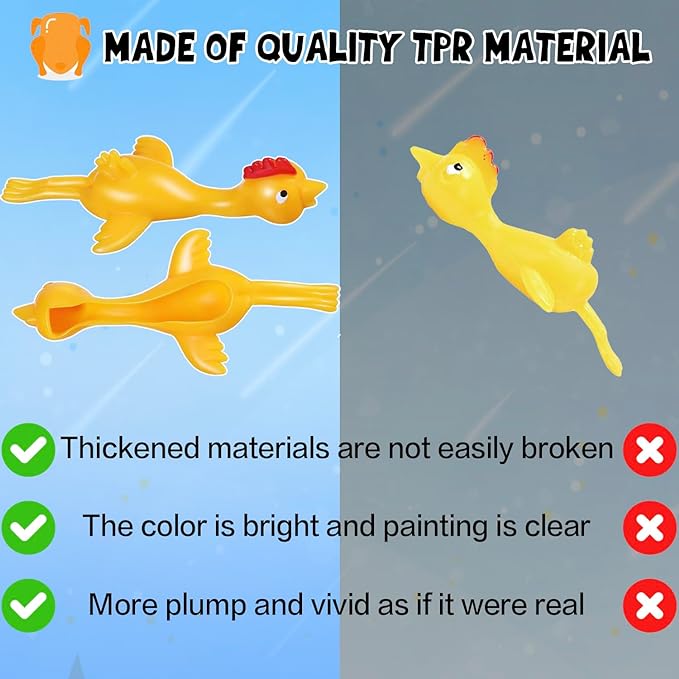 - RUBBER CHICKEN SLINGSHOT PREMIUM QUALITY & SAFETY: Made of environmentally friendly TPR material, soft safe & non-toxic, looks like easter chicks or thanksgiving turkeys, small unique & unusual, suitable for children & adults. Washable & Reusable, easy to wash off the dirt, can be reused after a simple clearance with soap water for another flying. Cute Nice & flexible, can stick to the walls windows ceiling and didn't leave any marks. Note: please don't aim at the vulnerable parts such as eyes.