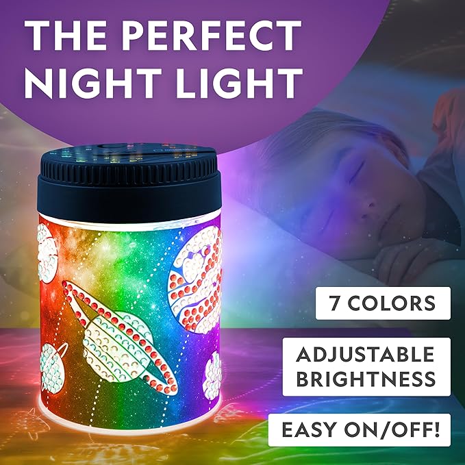 - KID-FRIENDLY DECORATING - With the space-themed wrap and colorful gemstones, it's easy for kids to decorate their night light with their own unique designs! 2 styluses for applying gems are included so friends and siblings can get in on the fun!