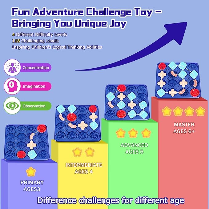 - 【Educational Toys and Engaging】The classic board games combine puzzles, mazes, and track cars, offering over a hundred ways to play and four difficulty levels. It stimulates imagination, creativity, cognitive skills, and hands-on learning. The detailed instruction manual with 118 problems and solutions provides guidance for kids to progress from beginners to masters.
