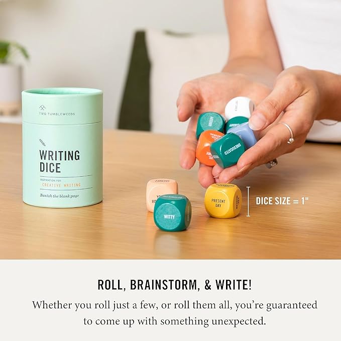- INCLUDES: 9 color-coded wood dice (1 inch with easy-to-read text) that cover Who, What, When, Where, & Why in depth. Just roll, brainstorm, & write!