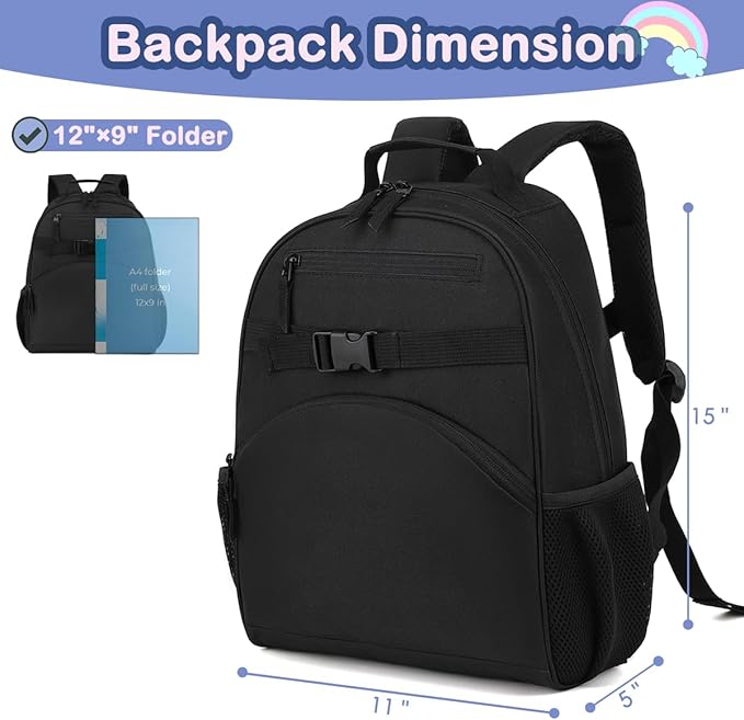 FlowFly Kids Backpack for Toddler Boys Girls, Simple Lightweight Bookbag for Daycare Kindergarten Elementary School Travel, Small Modern Bag (Medium 15'', Black)