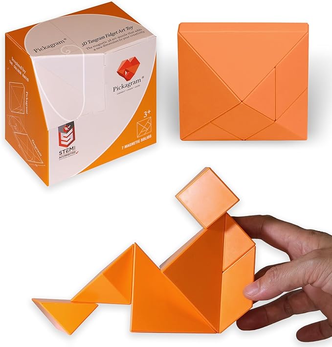 Pickagram Tangram 3D Magnetic Puzzle for Kids (8-12), Adults & Seniors | STEM Certified Fidget Puzzle - Magnetic Pattern Blocks for Cognitive Development, Creativity & Focus - Orange