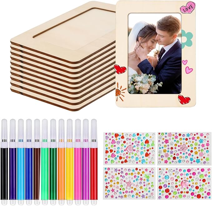 - Picture frame painting craft kit:The package include 10pcs wooden picture frame,12pcs painting color pen,4 sheet crystal diamond stickers,it’s a perfect combination for diy craft