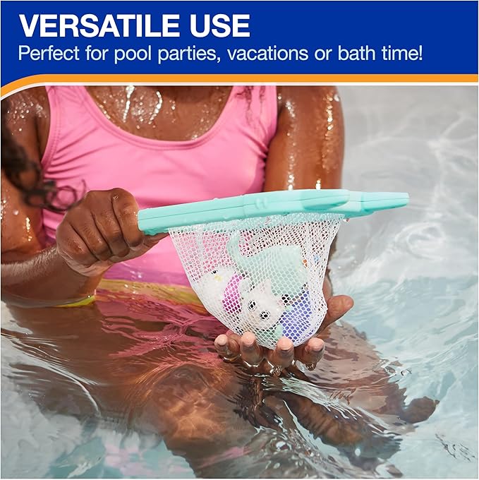 - FUN POOL GAME: Toss the characters into the pool then swim to retrieve them with the folding net - each character floats at different depths, adding to the fun of catching them