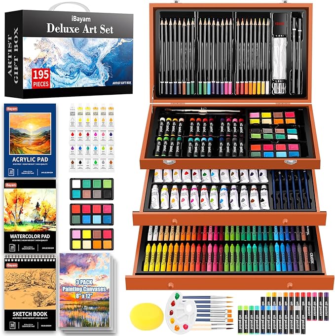 iBayam Deluxe Art Set, 195-Pack Artist Gift Box, Arts and Crafts Drawing Painting Kit Art Supplies for Adults Kids, Art Kits Paint Set with 24 Acrylic Paint, Sketchbook, Canvases, Crayons, Pencils