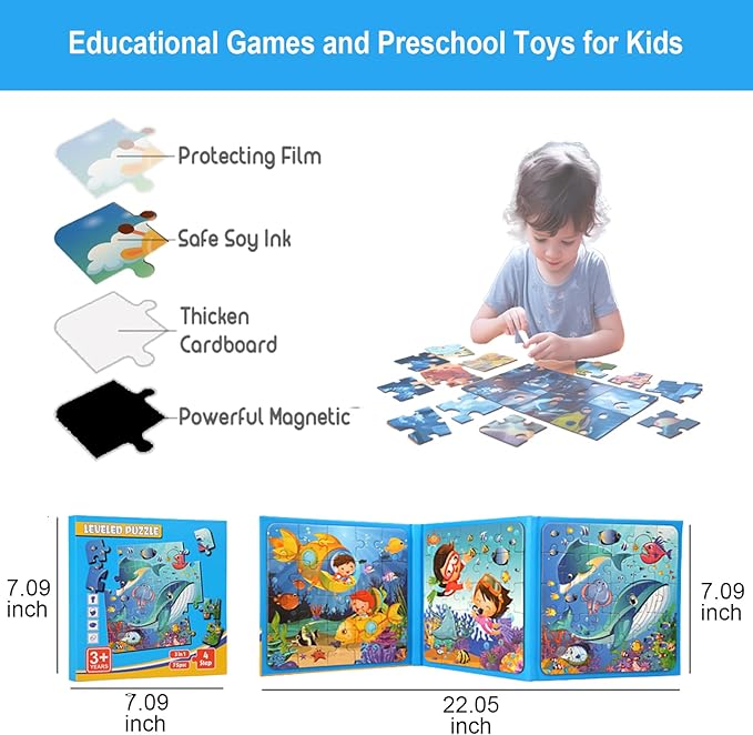 - 【Magnetic Puzzles for Kids Ages 3-5】There are multiple advanced versions of the puzzle, with higher levels and higher levels of difficulty, from easy to difficult, full of fun and challenges. Each version has 3 parts, corresponding to different difficulty levels of puzzle blocks. Each version has different theme content (forest animals, transportation, ocean world), which can not only exercise children's hands-on skills but also improve cognitive abilities