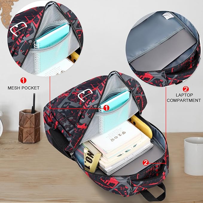 LEDAOU School Backpack Teen Boys Kids Bookbag Daypack School Bag (Graffiti Red Black)