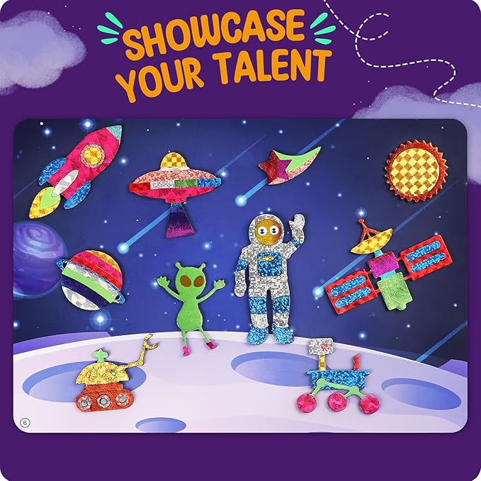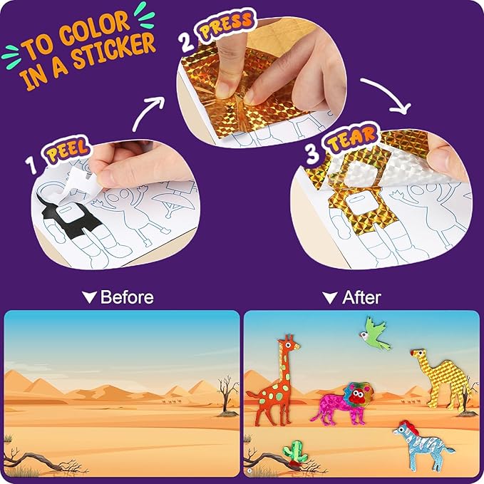 - Foil Sticker Art Activity: Spark your child's creativity with our magical foil art craft activity kit! They can create fun pictures featuring sheep, dinosaurs, tigers, elephants, rockets, aliens, and more