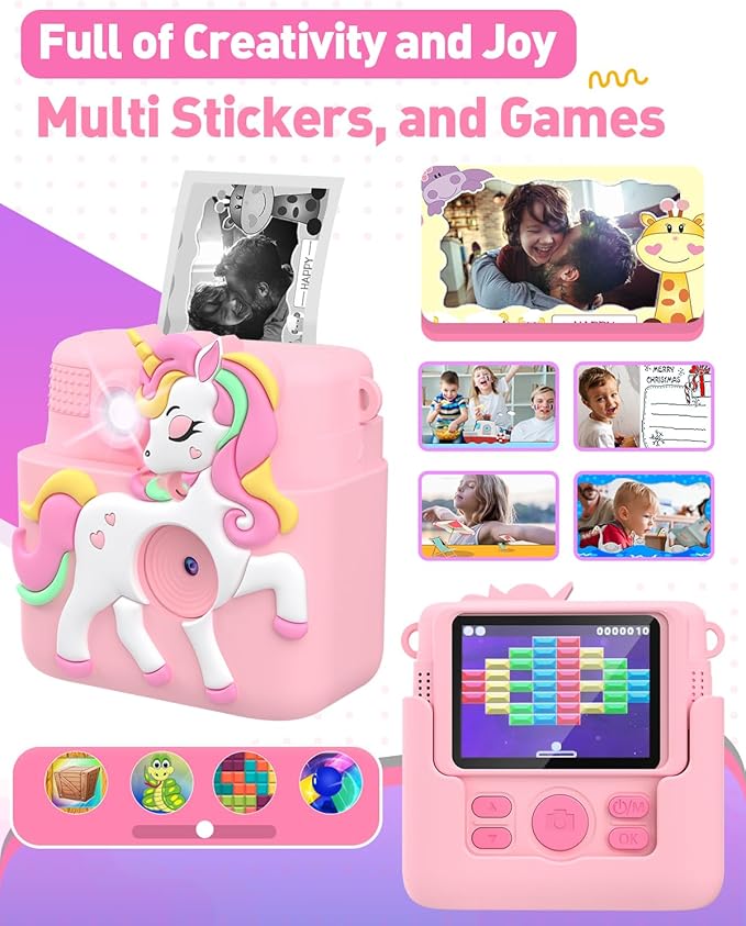 - Anti-Drop Camera Toys for Kids: Covered with a cute horse protective silicone case, this printable camera is adorable, shockproof and enduring; Designed with a neck strap, our kids camera toy is pocket size and can be held everywhere for girls and boys; Little children can record every moments themselves at family gatherings, school camping, outdoor activities, parties booth, and travel; Why not choose our cool toys camera and foster a budding photographers?