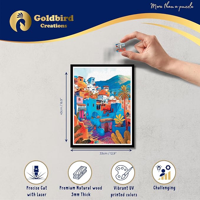 Magnetic Wooden Puzzles with Frame for Adults - Framed Wooden Jigsaw Puzzle - Rompe Cabezas para Adultos - Landscape Wall Art Decor - Original Christmas & Birthday Gift (Chefchaouen)