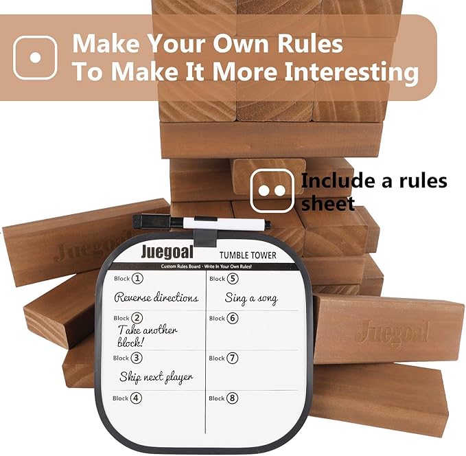 - Giant Size Timber Game Set: Juegoal large size brown color giant tumble tower set comes with 54 pieces wooden tumble blocks, 1 pcs game board with pen and a zipper bag. Each block is 6.9 x 2.3 x 1.2 inch, 2FT (18 rows) could be grown up to 4FT tall tower when played. A great fun, fast-paced stacking game and indoor or outdoor playing game for all ages