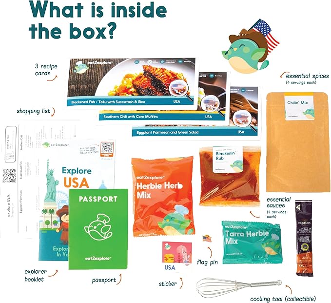 - Explore USA Through Cooking: Craft traditional dishes like Blackened Fish, Southern Chili and Eggplant Parmesan using included spices & sauce, Chilin Mix, Blackenin Rub, Herbie Herb Mix, Tarra Herbie Mix, Vinegar of Modena which bring the rich flavors of american cuisine right to your kitchen table. Ideal for family bonding and expanding your culinary skills.