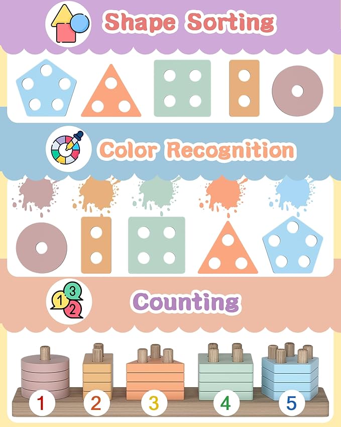 - Montessori toys for toddlers : Wooden sorting and stacking puzzle contains 20 pieces including five colors: red, orange, yellow, green and blue, and five shapes: pentagon, square, rectangle, triangle and circle. It provides a variety of collocation and play possibilities, starting from the basic color and shape, to cultivate children's hand-eye cooperation ability, color recognition, fine motor skills, mathematical ability, physical spatial thinking and independent ability to solve problems. Is a fun and challenges of baby toys, together with you to explore children's creative ability.