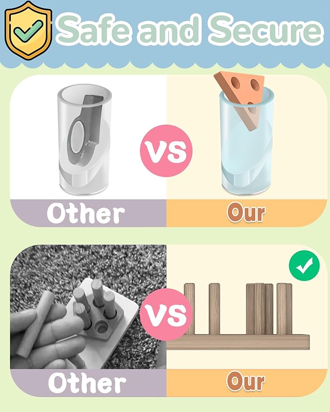 - Safe and high-quality toddler toys : We insist on using high quality wood raw materials to provide safe and fun toys for toddlers. The toddler learning toys with a moderate geometric size and smooth edges, can be grasped well by babies while protecting the baby's delicate skin. We also use the water-based paint, the color more vivid, non-toxic, odorless and anti-fade, for your baby safe and happy childhood.