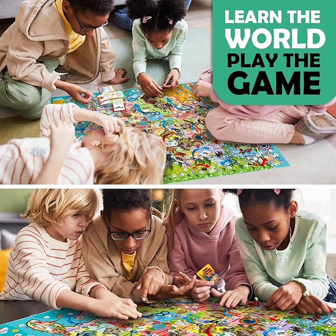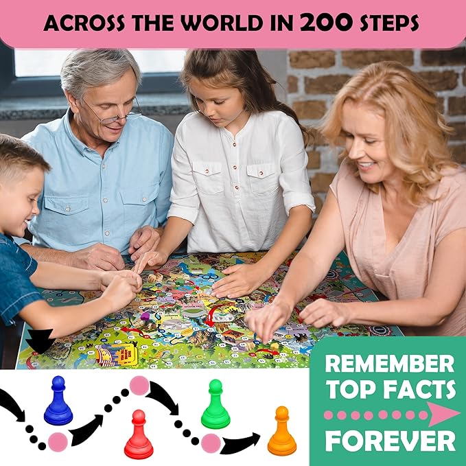 - HUGE USA MAP GAME: In this race you have a chance to check your luck & basic knowledge of the world; Board game size 47"x 28" with 120 educational question cards; Move your pawn through the USA map while overcoming obstacles with correct answers