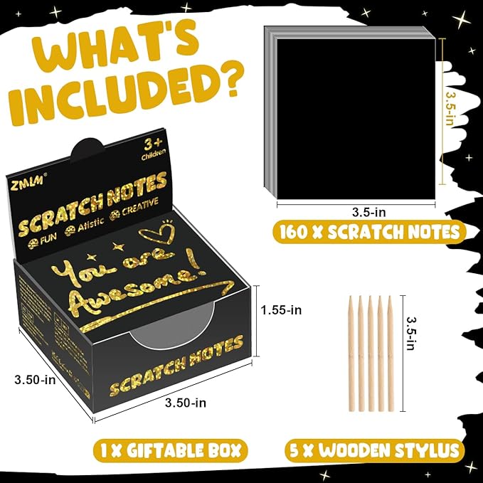 - Gold Holographic Scratch Art Mini Notes: Our scratch art paper with 160 sheets of holographic scratch paper note cards (Size: 3.5*3.5inch /8.5*8.5cm) and 5 Styluses(3.5inch/8.5cm). Super Bulk kids art craft kits for fun way to doodle, leave notes, write Lists and and create cool illustrations and designs. Both kids and adults love exercising their imaginations with this bulk art craft Christmas gift