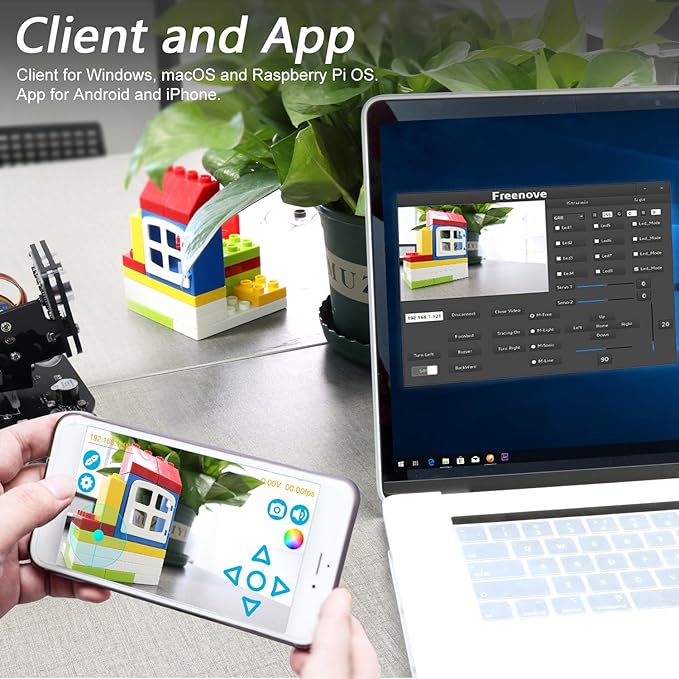 - Control Methods: Controlled wirelessly by your Android phone or tablet, iPhone (with Freenove App) and computer (run Windows, macOS or Raspberry Pi OS)