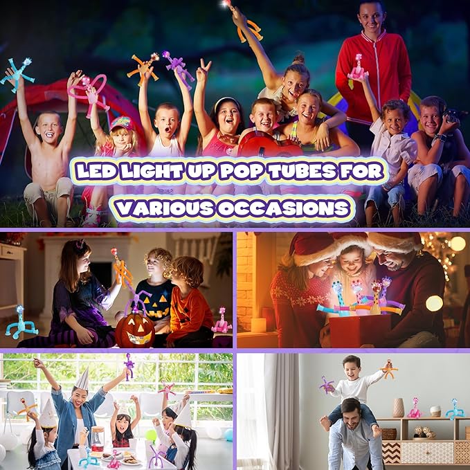 - LED Pop Tubes: The sensory fidget toy set comes with colorful LED lights. Shake it and it will flash, just like magic. Perfect to keep your little baby busy and entertained! That will definitely impress your kids and bring much of fun moments during the day and night