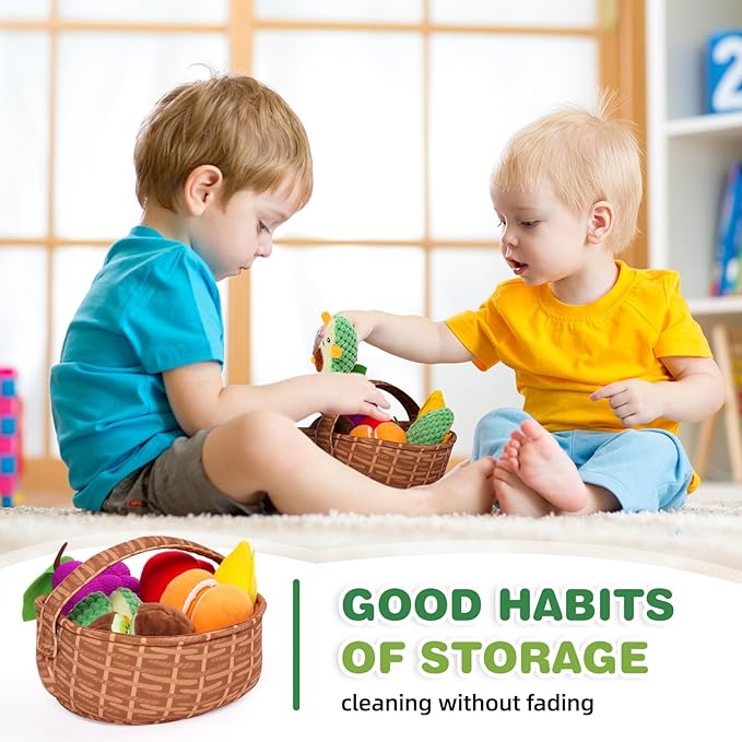 - TODDLER PLUSH FRUIT TOY: Our plush stuffed fruit food toys for baby 0-6-12 months is a delightful bundle of joy, complete with a variety of adorable fruits like avocado squish, kiwi, banana, orange, grapes, and apple. The fabric of fruits and baskets is very soft. Unlike some plastic products, they have unpleasant odors and may even scratch your baby's hands. The handle of the toddler soft fruit Basket Toys is cleverly designed to be detachable, making it a breeze to tidy up and easy to clean.