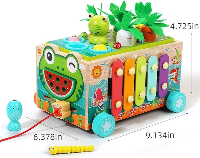 - MONTESSORI 1 YEAR OLD TOY FOR TODDLERS: The package you receive contains a multifunctional montessori activity cube packed in a box. The parts include - 1 cute frog, 6 radishes, 4 caterpillars, 3 fish and 3 blue plastic ponds for fish, 1 fishing rod, 1 small hammer and a piece of watermelon.