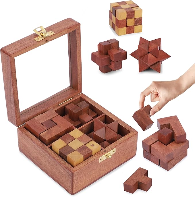 - Compact Interlocking Puzzle Set with Display Box – Includes 4 unique interlocking puzzles, neatly stored in a wooden case with a transparent glass lid. Great for organizing and showcasing your brain games while adding a touch of elegance to any desk or shelf.