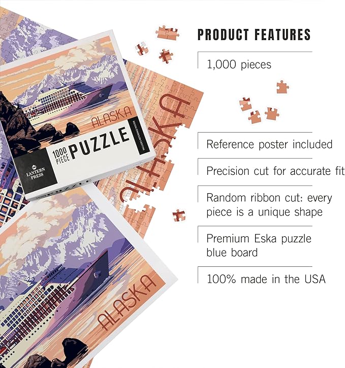 - 18.5 x 27.75 inches Lantern Press 1000 Piece Jigsaw Puzzle, Alaska, Cruise Ship and Sunset