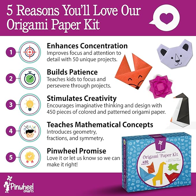 Pinwheel Crafts Origami Paper Kit 50 Projects with 450 Sheets of Colored and Patterned Paper - Easy Origami Kit for Kids Ages 5-8+, Fun Art and Crafts Gift Set for Boys and Girls