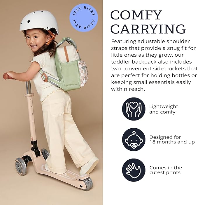 - COMFY CARRYING & SECURE BELONGINGS: The adjustable shoulder straps of our backpack for toddlers provide a comfy, customized fit for little shoulders. The top handles snap together for easy grab-and-go carrying, and the large, easy-access front zipper pocket keeps favorite toys secure.