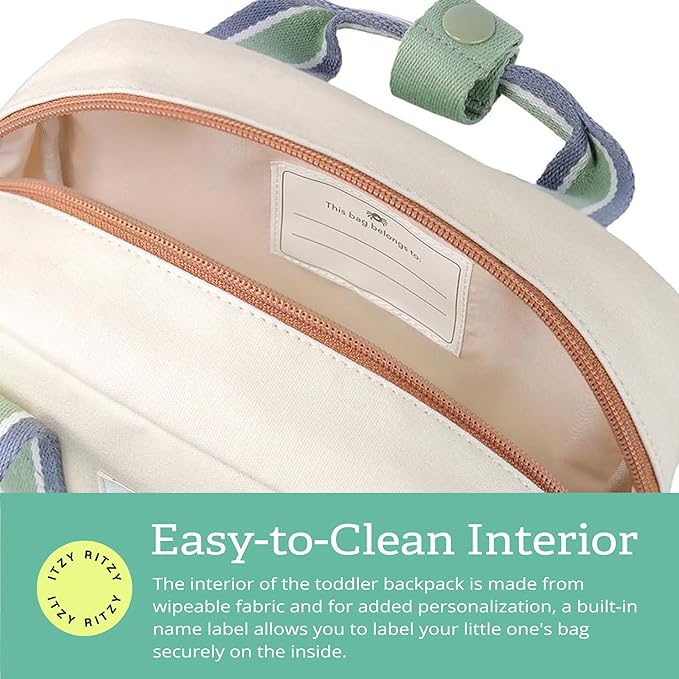 - SPACIOUS & EASY TO CLEAN: This toddler-sized backpack features a roomy, wipeable interior for easy cleaning and a sturdy cotton exterior for durability. It has an interior name label that ensures their bag never gets lost at daycare or while traveling. Plus, a handy side loop lets your little one personalize their bag with clips, charms, or their favorite toys!