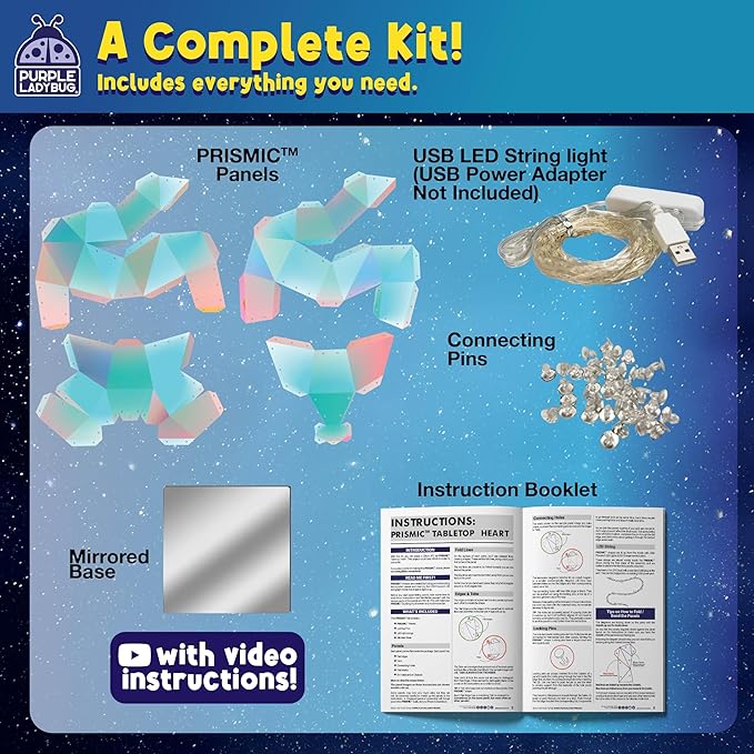 - All-In-One DIY Lantern Kit: Includes prismic panels, secure connector pins, mirrored base, USB-powered LED string lights, and detailed instructions for building a glowing 3D heart tabletop lamp.