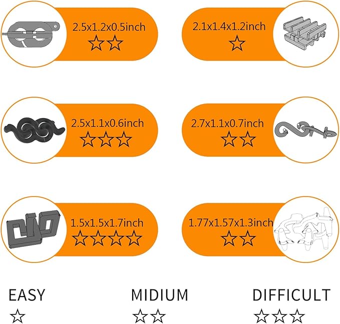 - 【Novelty Concept】Get an assortment of 6 different metal puzzles, ranging from easy to hard levels, making it fun for everyone. Whether you enjoy playing alone or with friends, these brain teaser puzzles for adults are guaranteed to offer hours of entertainment.Plus, with the included storage box, you can easily collect all the pieces and avoid losing them. If you're not sure how to solve a particular puzzle, the instruction manual will provide all the guidance you need.