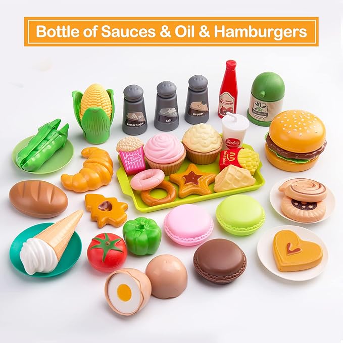 - 【Simulate life scenes & Cooking experience】Each kitchen set comes with 130Pcs stylish, open design and fresh colors pretend kitchen toys, include play pots and pans sets, kettle, bowls, plates, chopsticks, toy kitchen cookware, knives set, canned pretend cuttable food & vegetables & fruit with basket, fast food set, dessert and prop money, much more to provide endless hours of fun