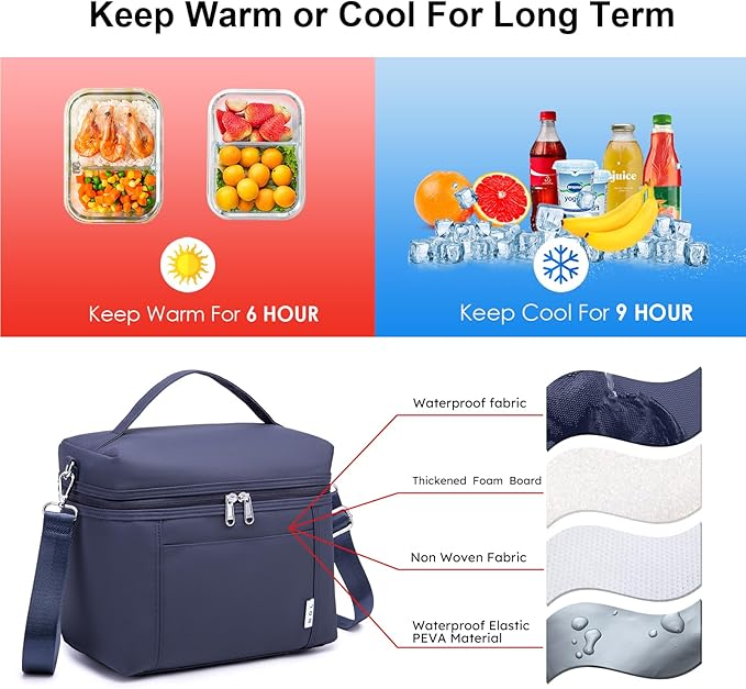- Insulation & Freezing: NOL lunch bag adopts three-layer heat insulation design: the outer layer is resistant 900D Oxford cloth and polyester fiber, the inner layer is Eco-friendly PEVA material and the middle layer is specially filled with 4mm thick insulating lining, which provide great insulation to keep the food warm or fresh up to 5 hours. Our reusable lunch box is very convenient to take food for work, office, picnic, camping and other activities.