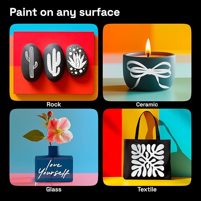 - PREMIUM QUALITY: This white-pack of paint pens features high-quality acrylic paint that dries opaque, so you don’t have to make a second layer! The ink in the paint markers for canvas is water-based and features a durable nib.