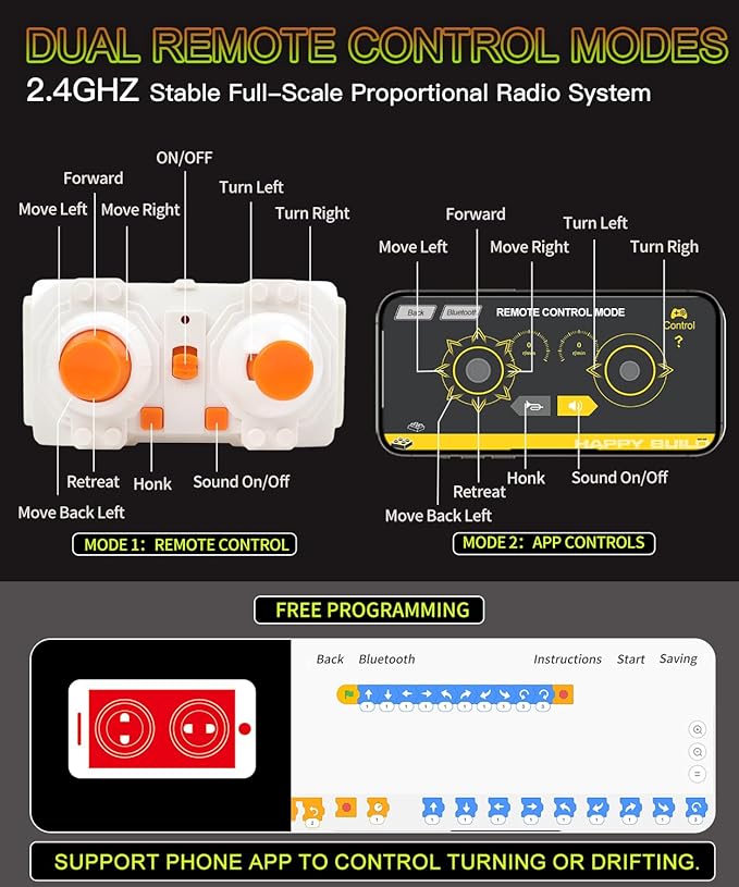 - Build a Remote-Controlled Car Building Block Set:This Pickup Truck building block toy equipped with high quality motors,and supports APP and remote control to control the car. It can realize forward, backward, left and right turns, and in-situ rotation,achieve all-terrain drift.Scan the QR code on the packaging or manual and experience multiple operation modes such as programming.