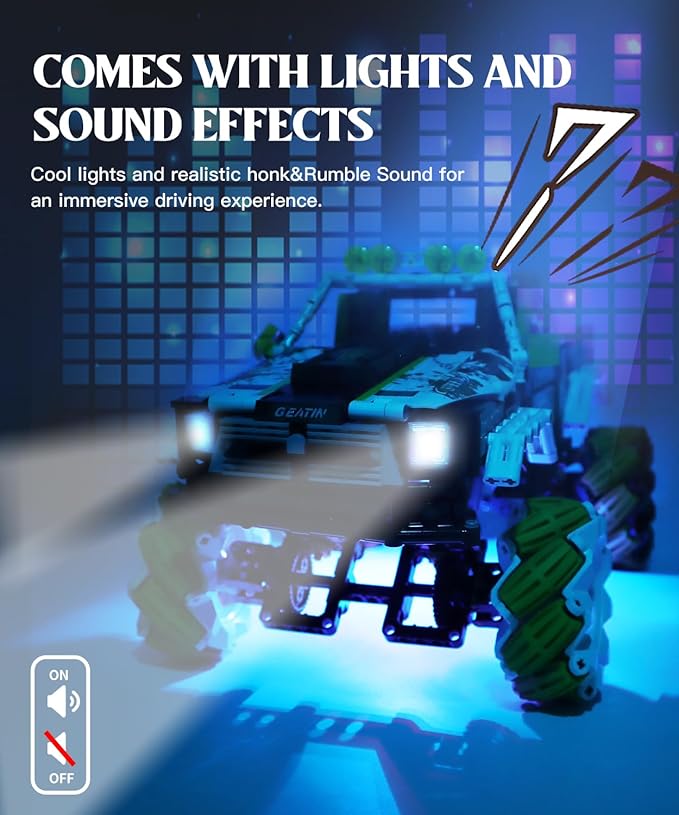 - Stunt Drift With Light and Sound-It's 4WD drive mode, It has Multiple Stunt drift function: 180°lateral drift,360°rotation in place,45°Z-Shape Drift.With led atmosphere lights and sound effects, the car will emit real car roar and horn sound effects when remote control operation.