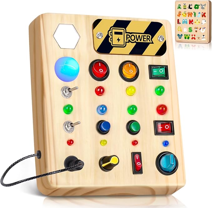 - 💡【12 LED + 12 Buttons Light Up Busy Board】Light switch board includes different colored and sized lights and buttons that can improve kids' sustained concentration and perception of cause and effect. Baby busy board needs 2 AAA Batteries (Not Included)