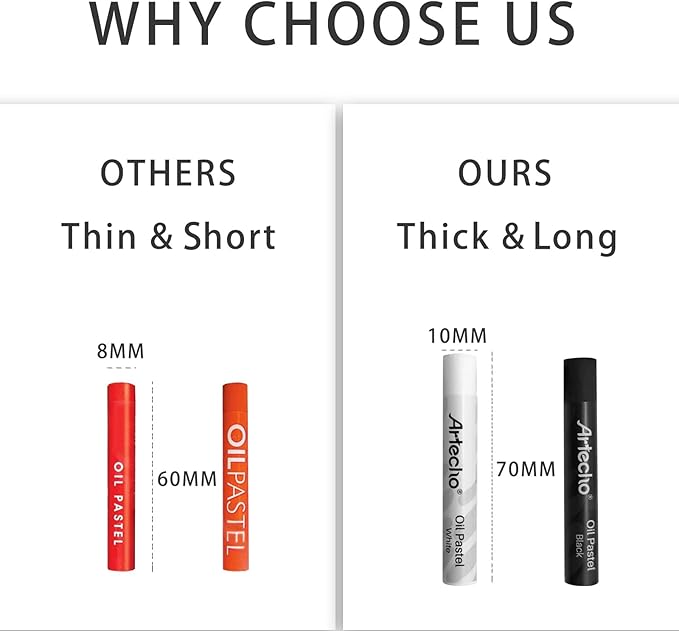 - Perfect Packaging: Humanized size design, can be easily put into all kinds of bags. Each oil pastel (70 mm × Ø 10 mm) has its own independent paper sleeve, not easy to fall off and break