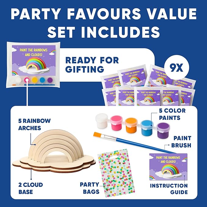 - VALUE SET RAINBOW PARTY FAVORS - This bulk party favors for kids contains everything you need. The box includes 9 premade goodie bags. Each rainbow craft gift pack includes 1 Rainbow, 6 Pastel Colors Paint-strip & Paintbrush