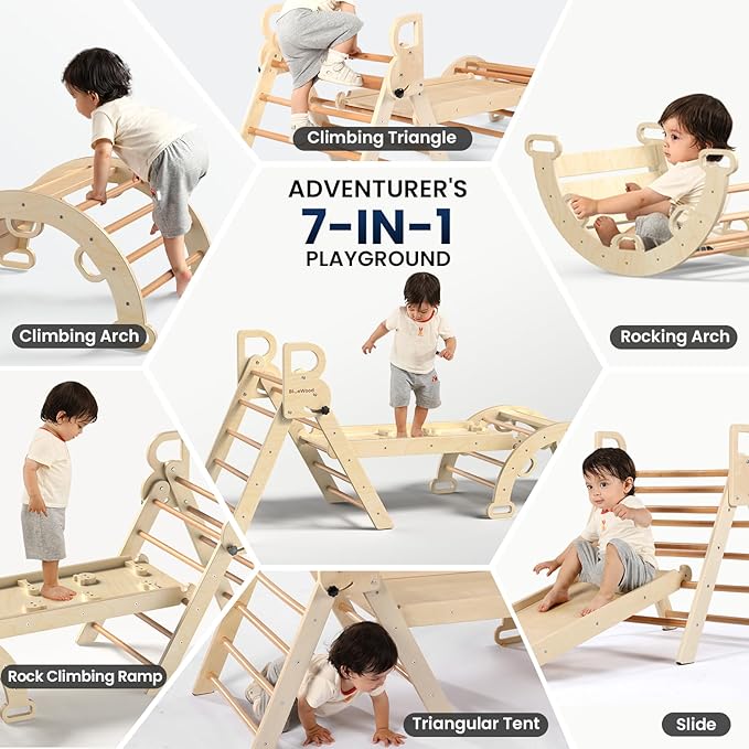 - 7 IN 1 Play Mode: 2024 upgraded Pikler Triangle set includes Triangle ladder & Slide & Arch ladder. Allows your baby to create at least 7 different modes for more play possibilities