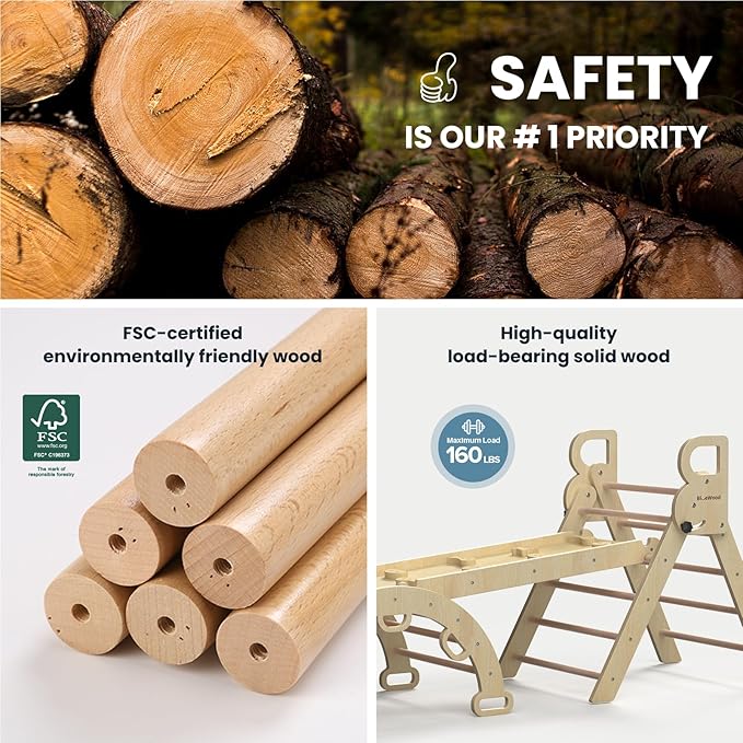 - Safer & Friendly: BlueWood Climbing Set is made from FSC-certified 100% natural solid wood, ensuring safety. Our toddler climbing toys meet ASTM F963-17 and CPSIA standards. Safety is our top priority